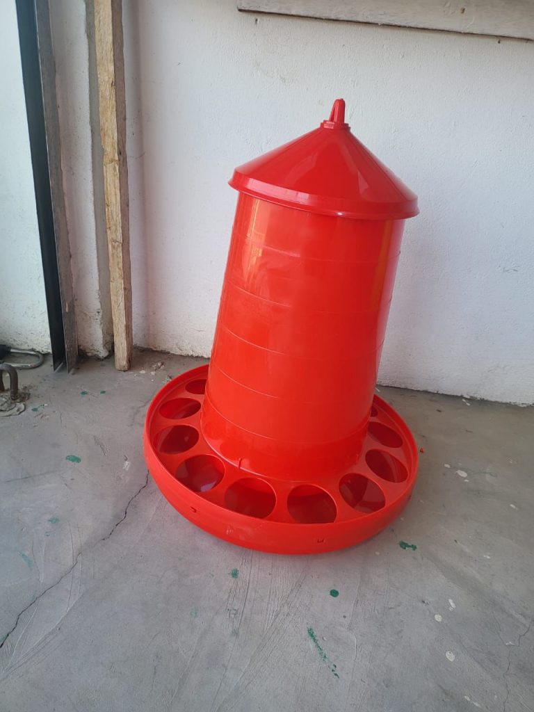 Engineered for larger flocks, this high-capacity red feeder offers a robust solution for gravity-fed feeding. Its wide base and large central cylinder ensure a steady flow of feed without the need for constant monitoring.